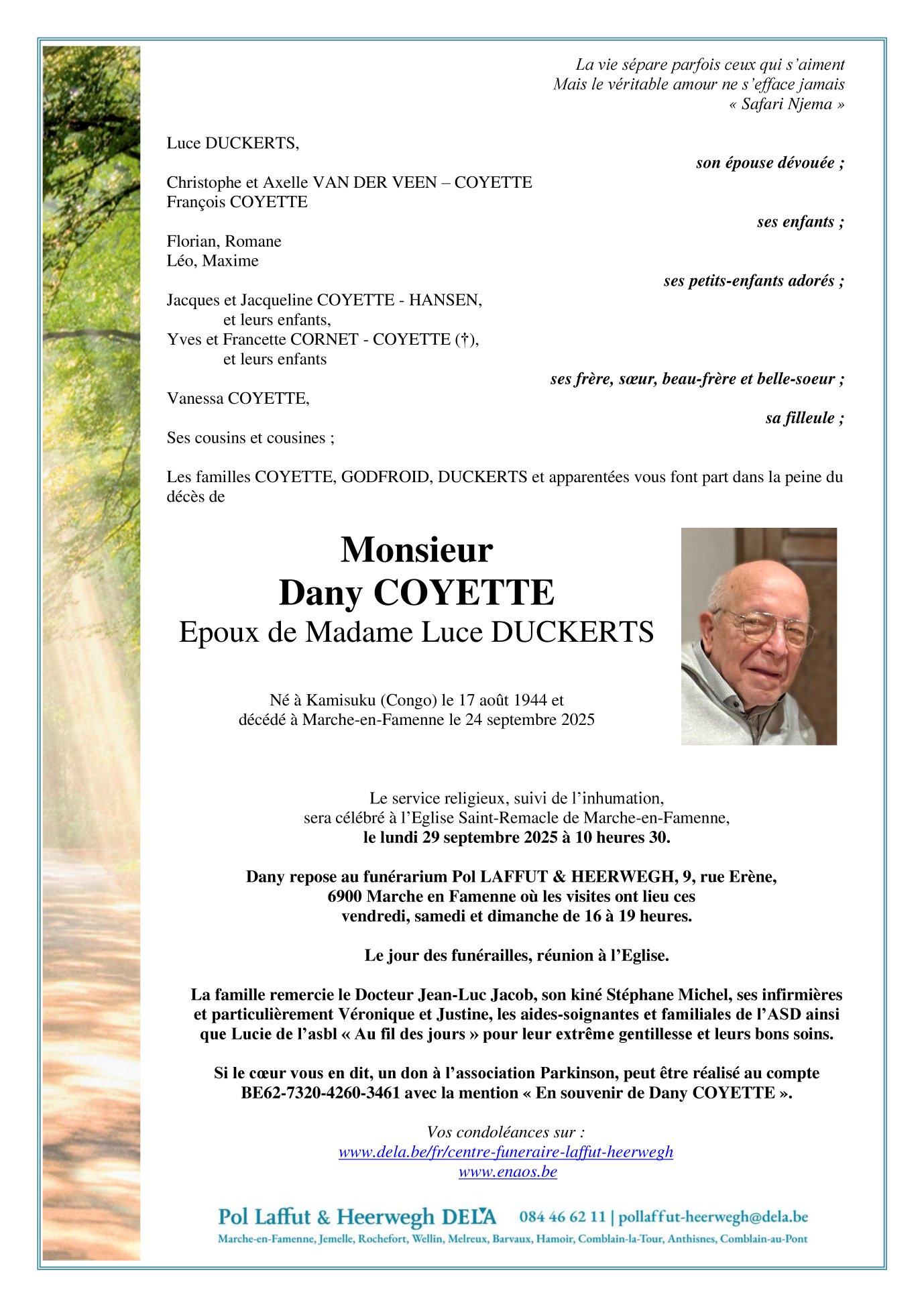 Décédé à Marche-en-Famenne (6900) le mercredi 24 septembre 2025 à l'âge de 81 ans