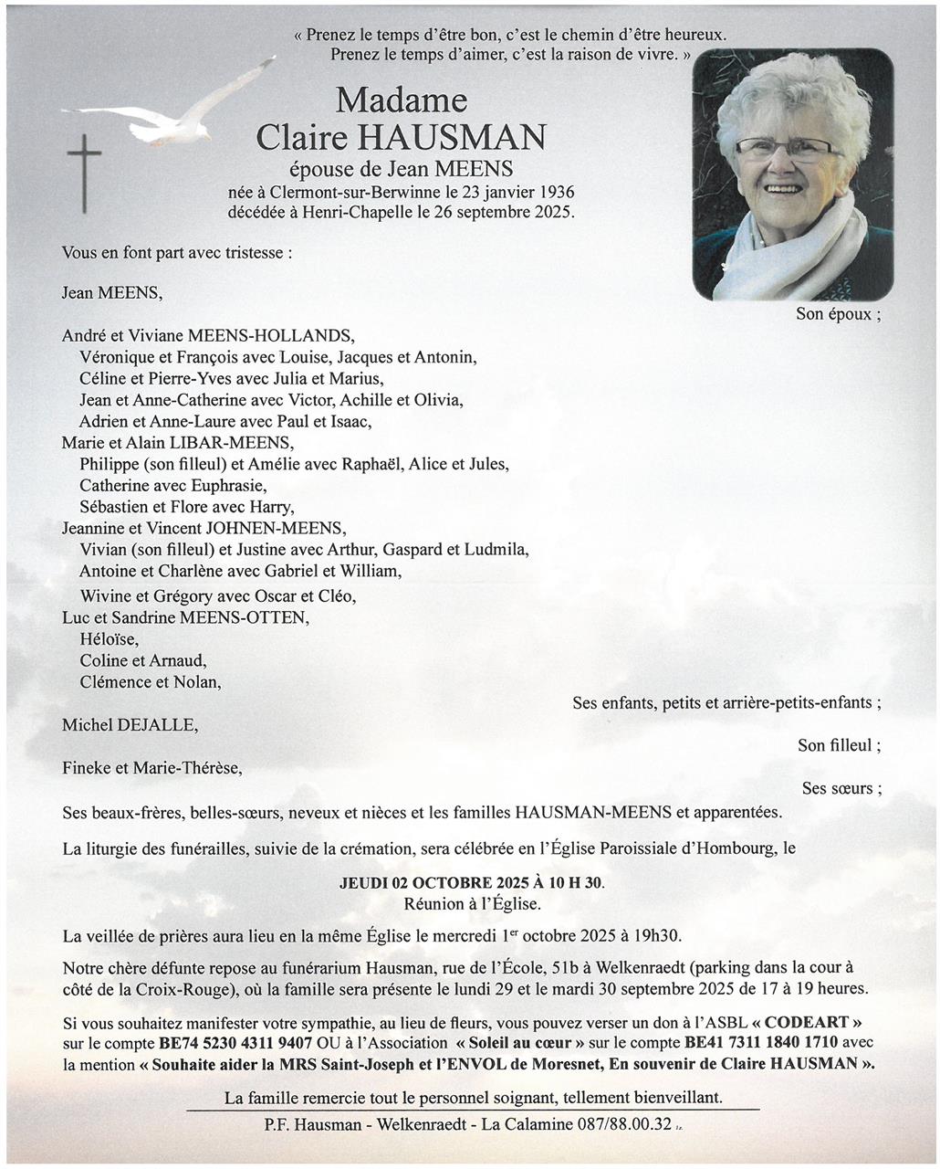 Fallecida en Henri-Chapelle (4841) el viernes, 26 de septiembre de 2025 a la edad de 89 años