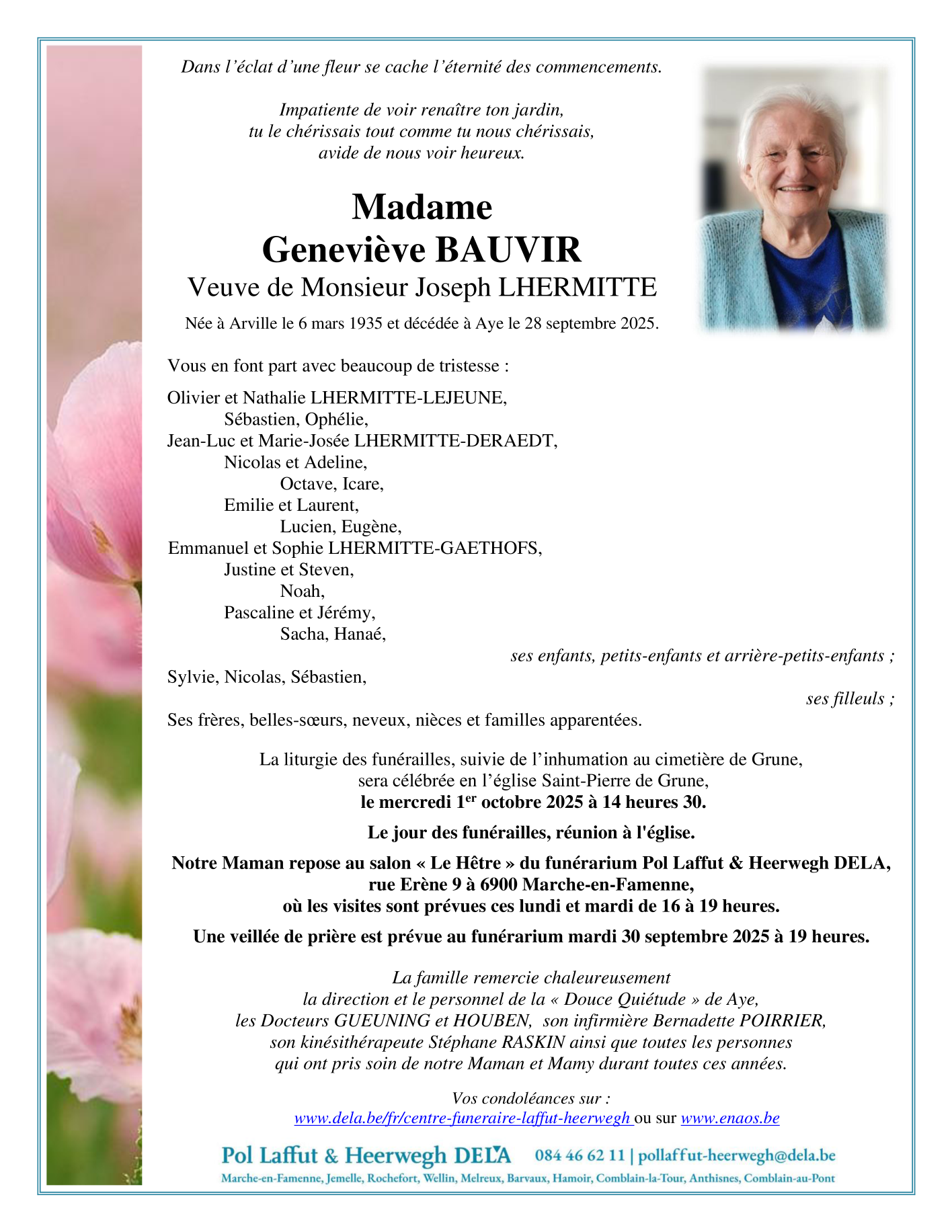 Décédée à Aye (6900) le dimanche 28 septembre 2025 à l'âge de 90 ans