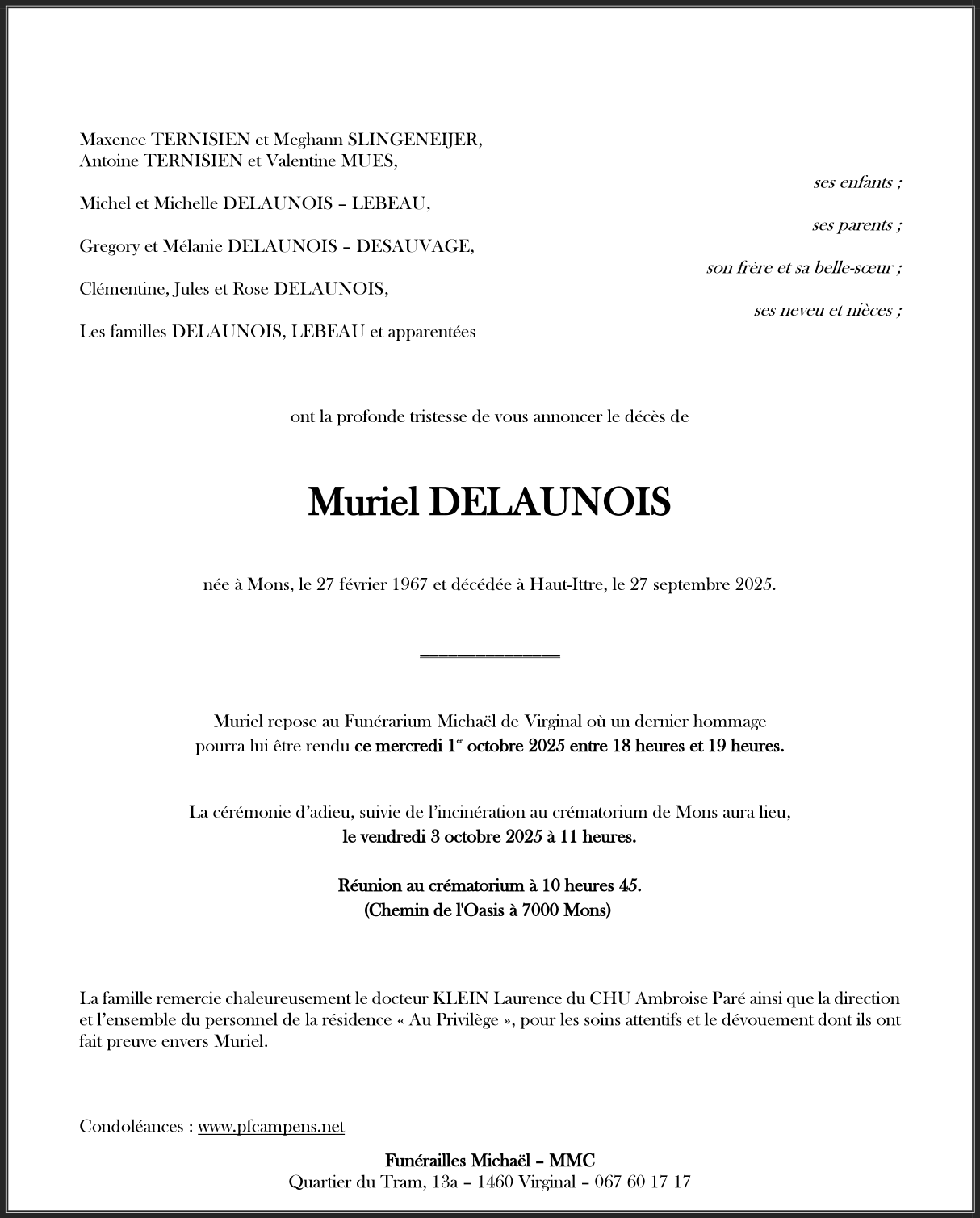 Fallecida en Ittre (1460) el sábado, 27 de septiembre de 2025 a la edad de 58 años