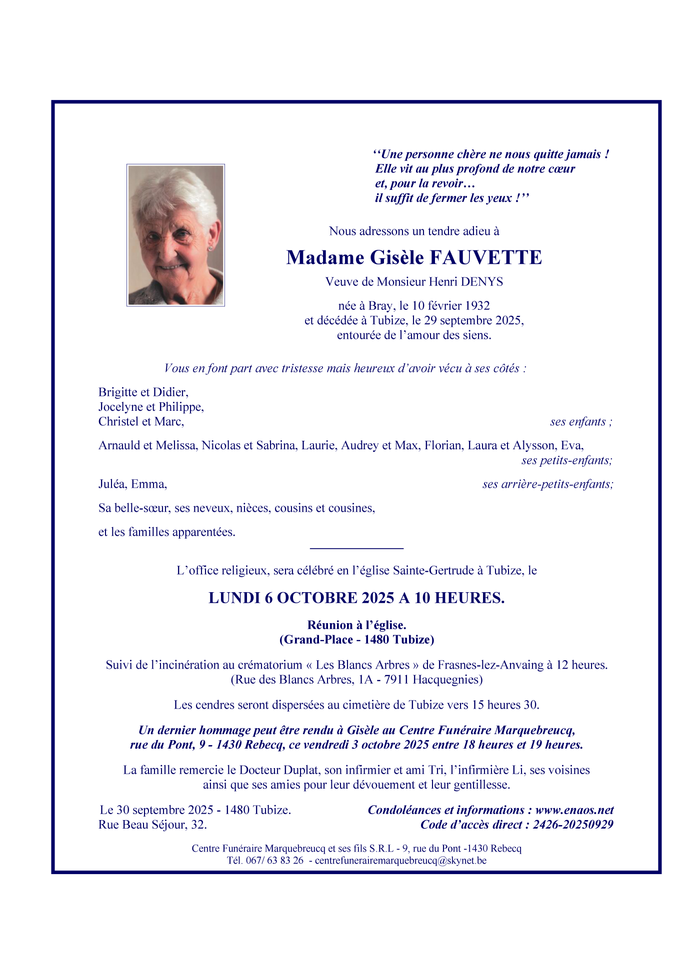 Décédée à Tubize (1480) le lundi 29 septembre 2025 à l'âge de 93 ans