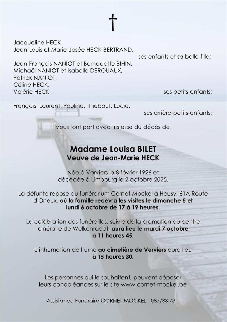 Décédée à Limbourg (4830) le jeudi 2 octobre 2025 à l'âge de 99 ans