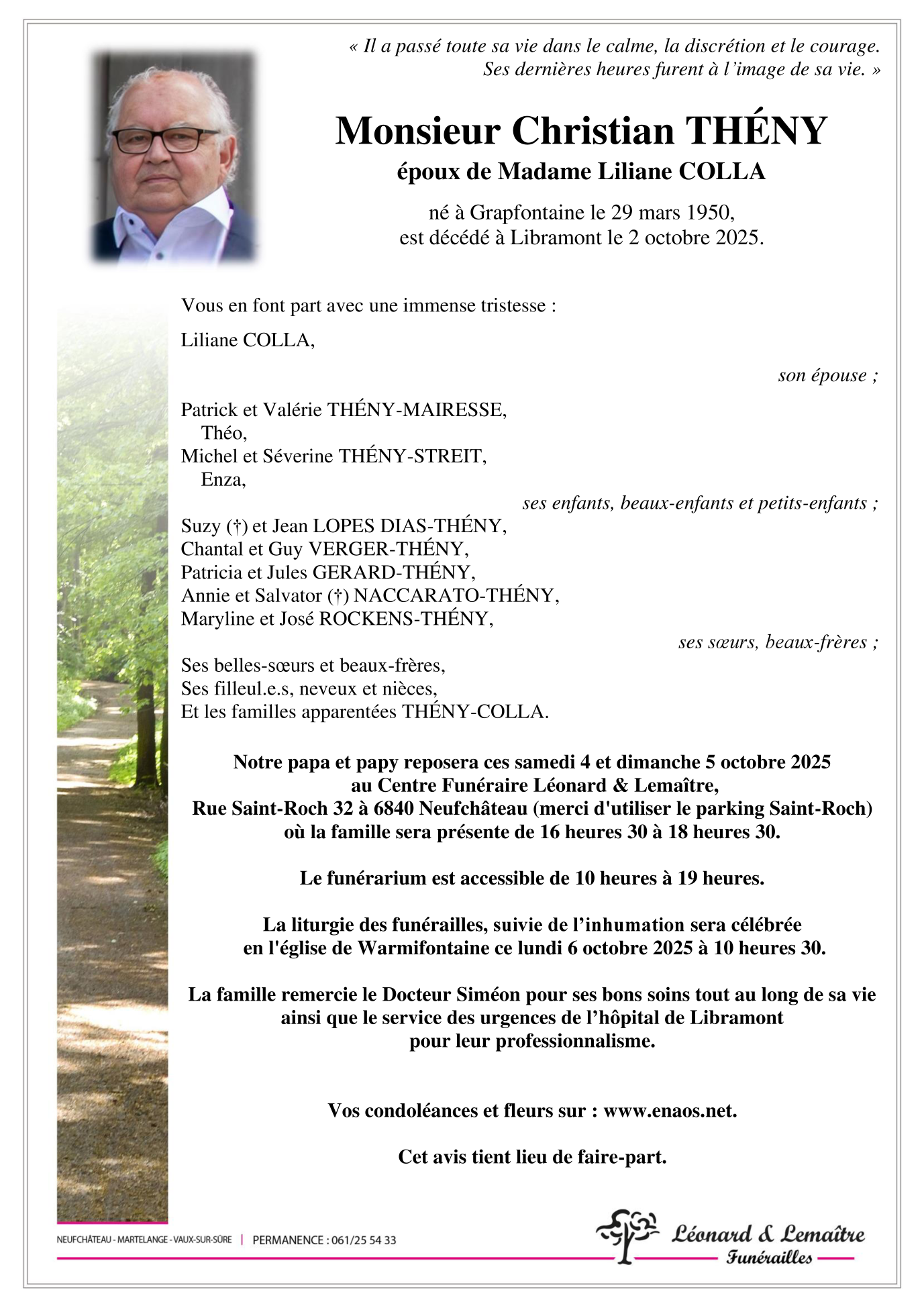 Died in Libramont-Chevigny (6800) on 02 October 2025 at the age of 75 years