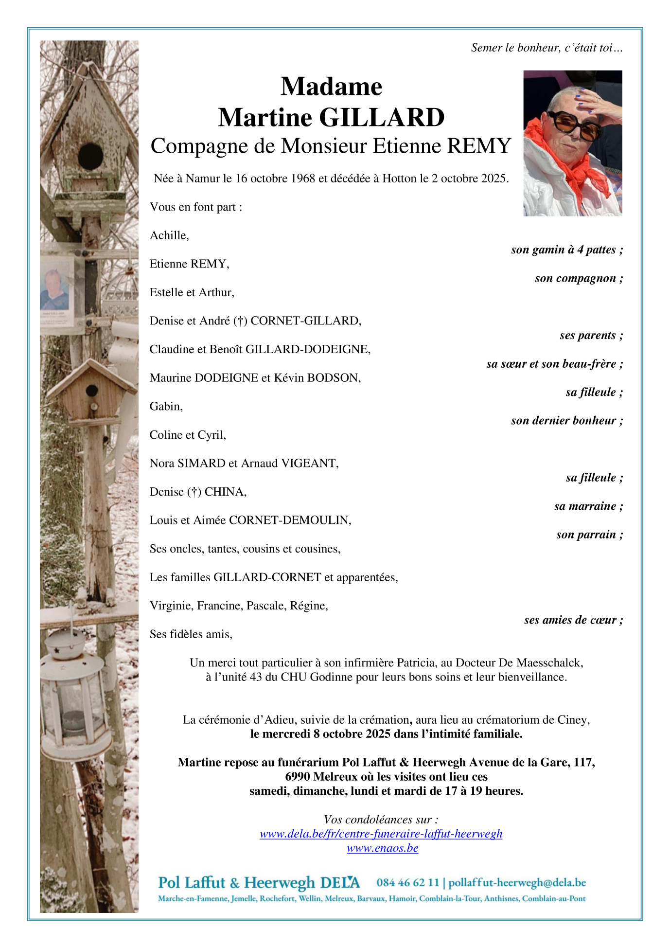 Décédée à Hotton (6990) le jeudi 2 octobre 2025 à l'âge de 56 ans