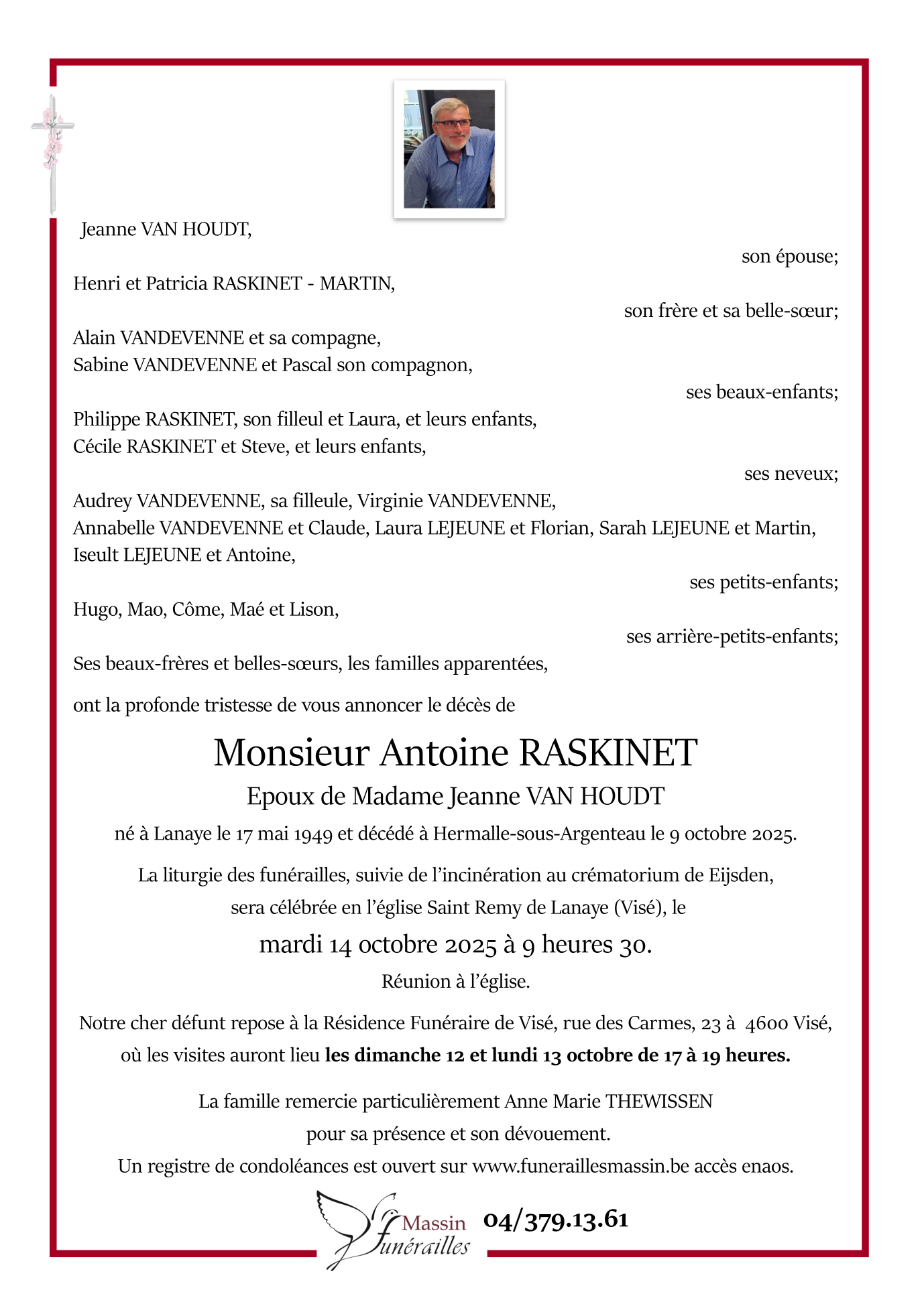 Décédé à Hermalle-sous-Argenteau (4681) le jeudi 9 octobre 2025 à l'âge de 76 ans