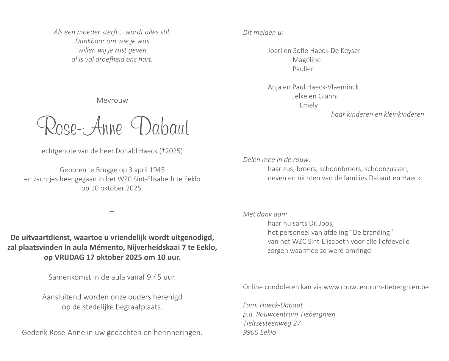 Décédée à Eeklo (9900) le vendredi 10 octobre 2025 à l'âge de 80 ans