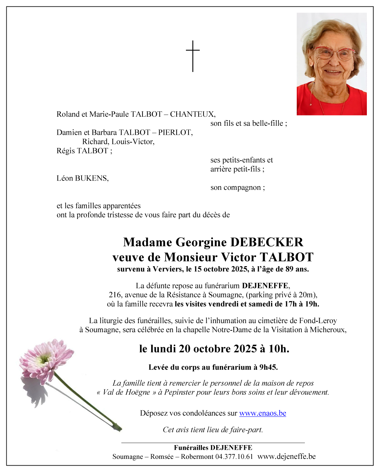 Décédée à Verviers (4800) le mercredi 15 octobre 2025 à l'âge de 89 ans