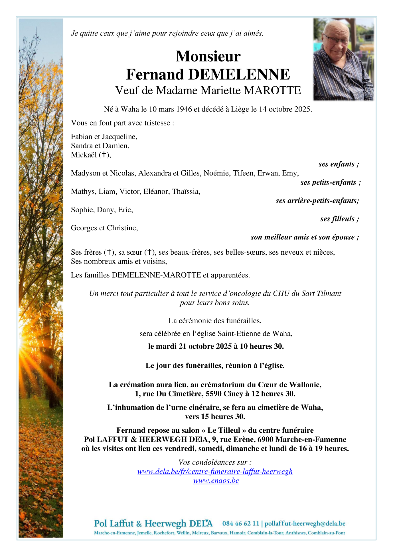 Décédé à Liège (4000) le mardi 14 octobre 2025 à l'âge de 79 ans