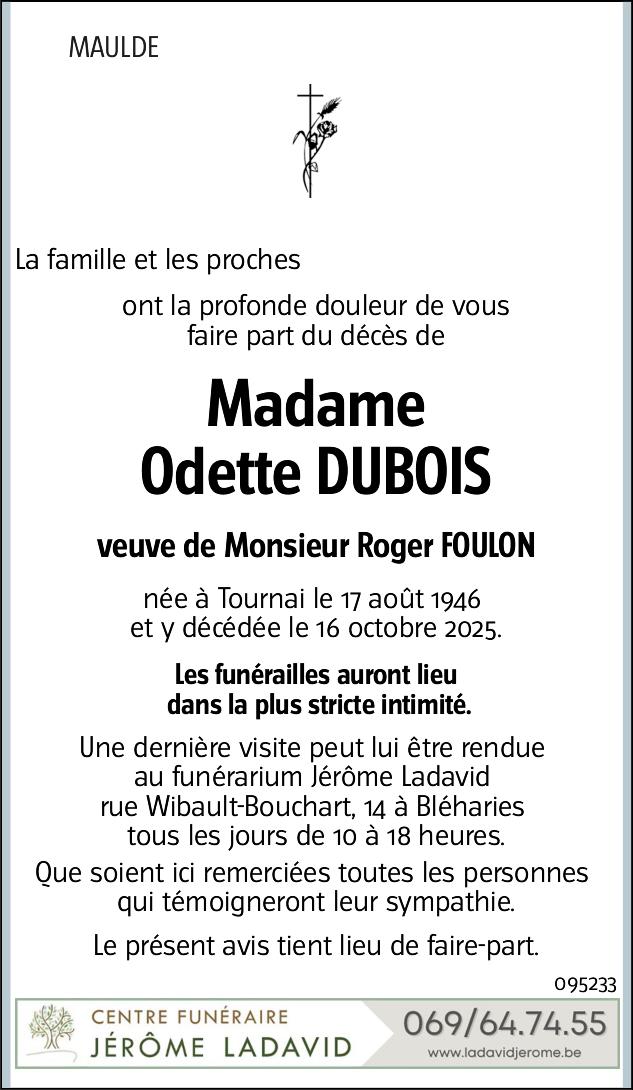 Décédée à Tournai (7500) le jeudi 16 octobre 2025 à l'âge de 79 ans