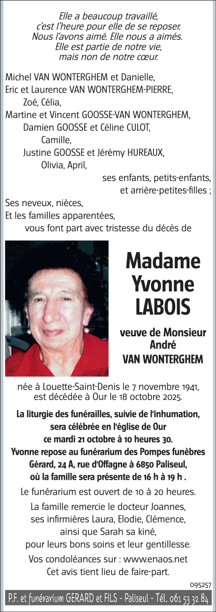 Décédée à Our (6850) le samedi 18 octobre 2025 à l'âge de 83 ans