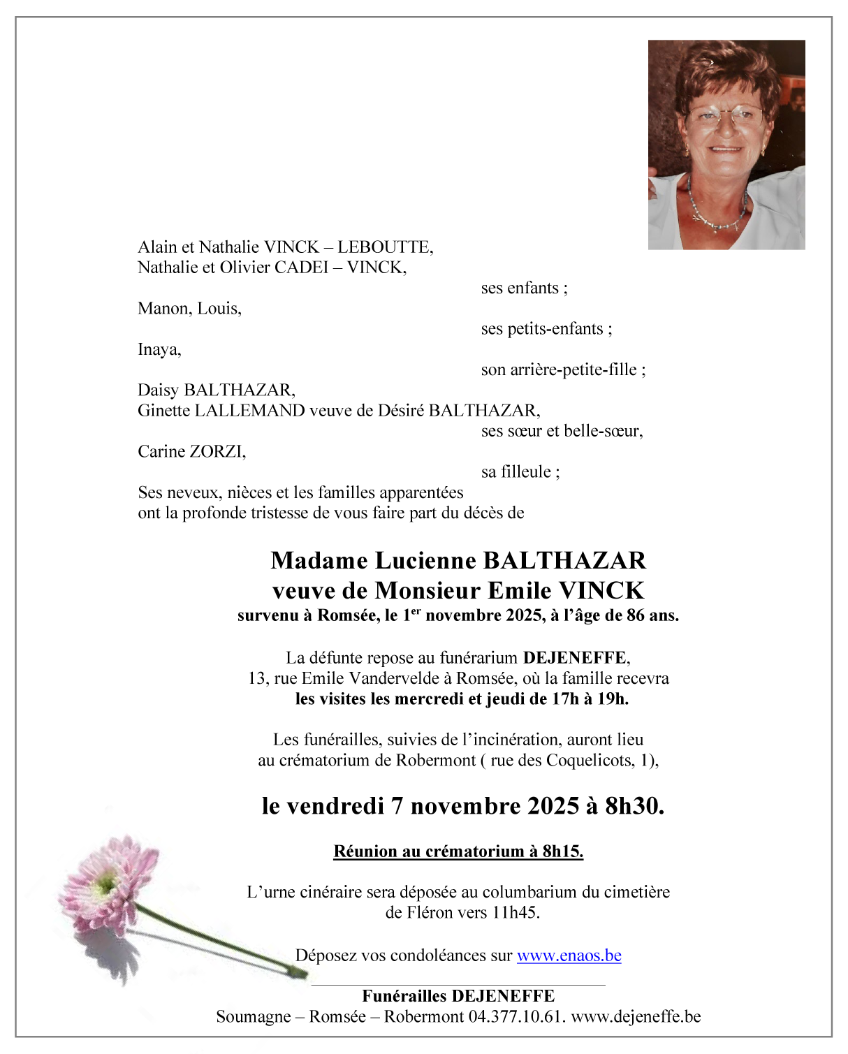 Décédée à Romsée (4624) le samedi 1 novembre 2025 à l'âge de 86 ans