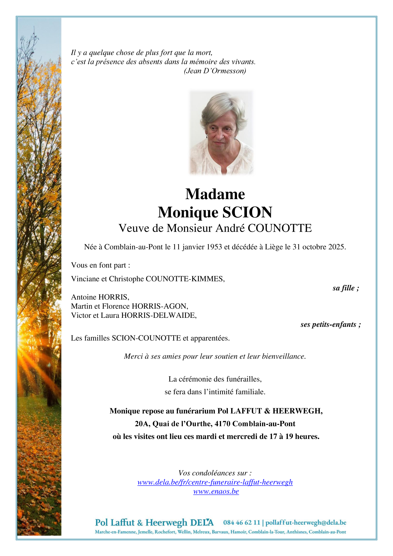 Décédée à Liège (4000) le vendredi 31 octobre 2025 à l'âge de 72 ans