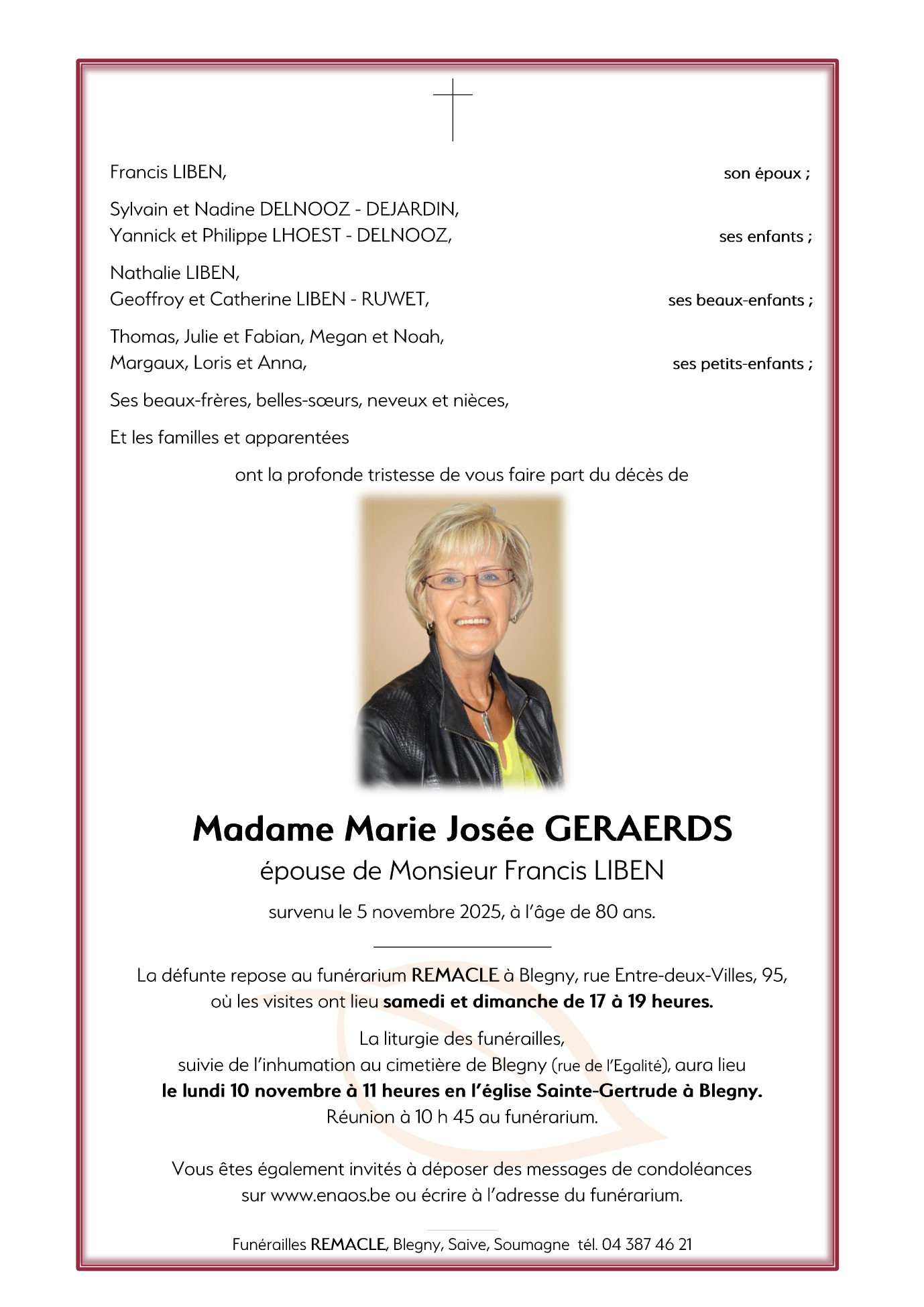 Décédée à Herstal (4040) le jeudi 6 novembre 2025 à l'âge de 80 ans