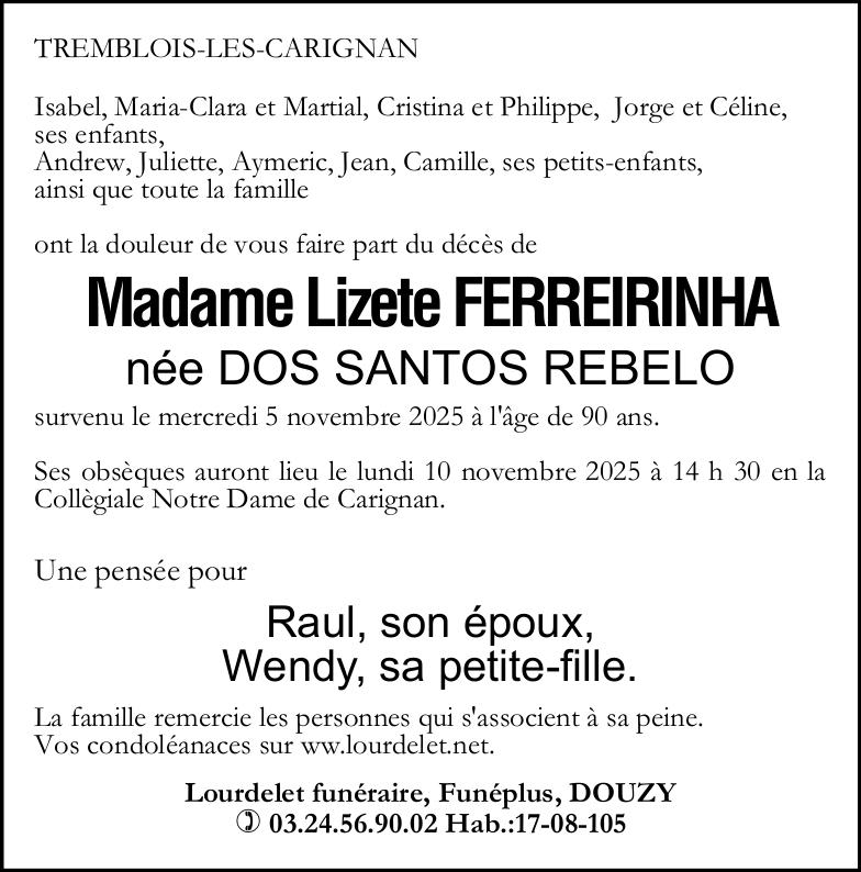 |  Domiciliada en Wadelincourt (08200, Francia) Nacida en Mira (3070 - 301, Portugal) el domingo, 24 de marzo de 1935 Fallecida en Wadelincourt (08200, Francia) el miércoles, 5 de noviembre de 2025 a la edad de 90 años Viuda de Monsieur Raul FERREIRINHA