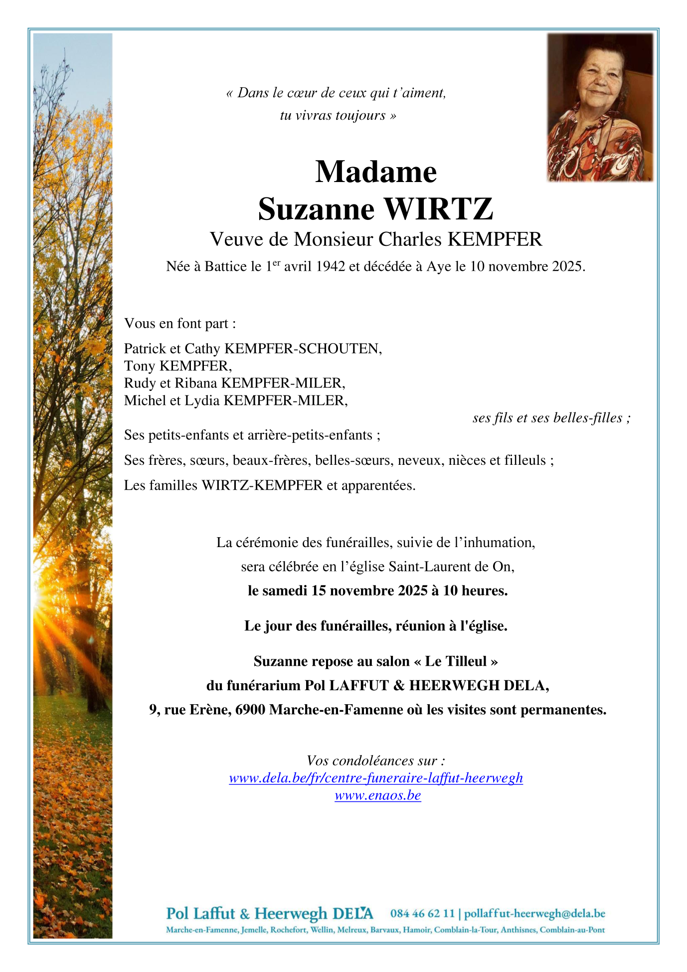Décédée à Aye (6900) le lundi 10 novembre 2025 à l'âge de 83 ans