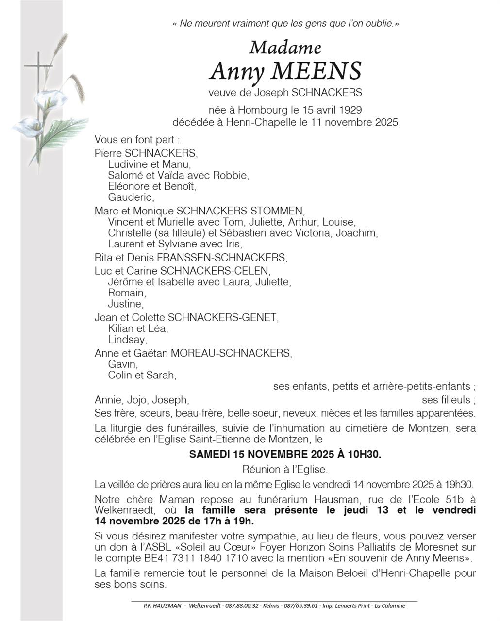 Décédée à Henri-Chapelle (4841) le mardi 11 novembre 2025 à l'âge de 96 ans