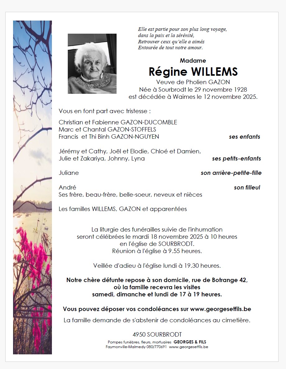 Madame Régine WILLEMS veuve de Pholien GAZON