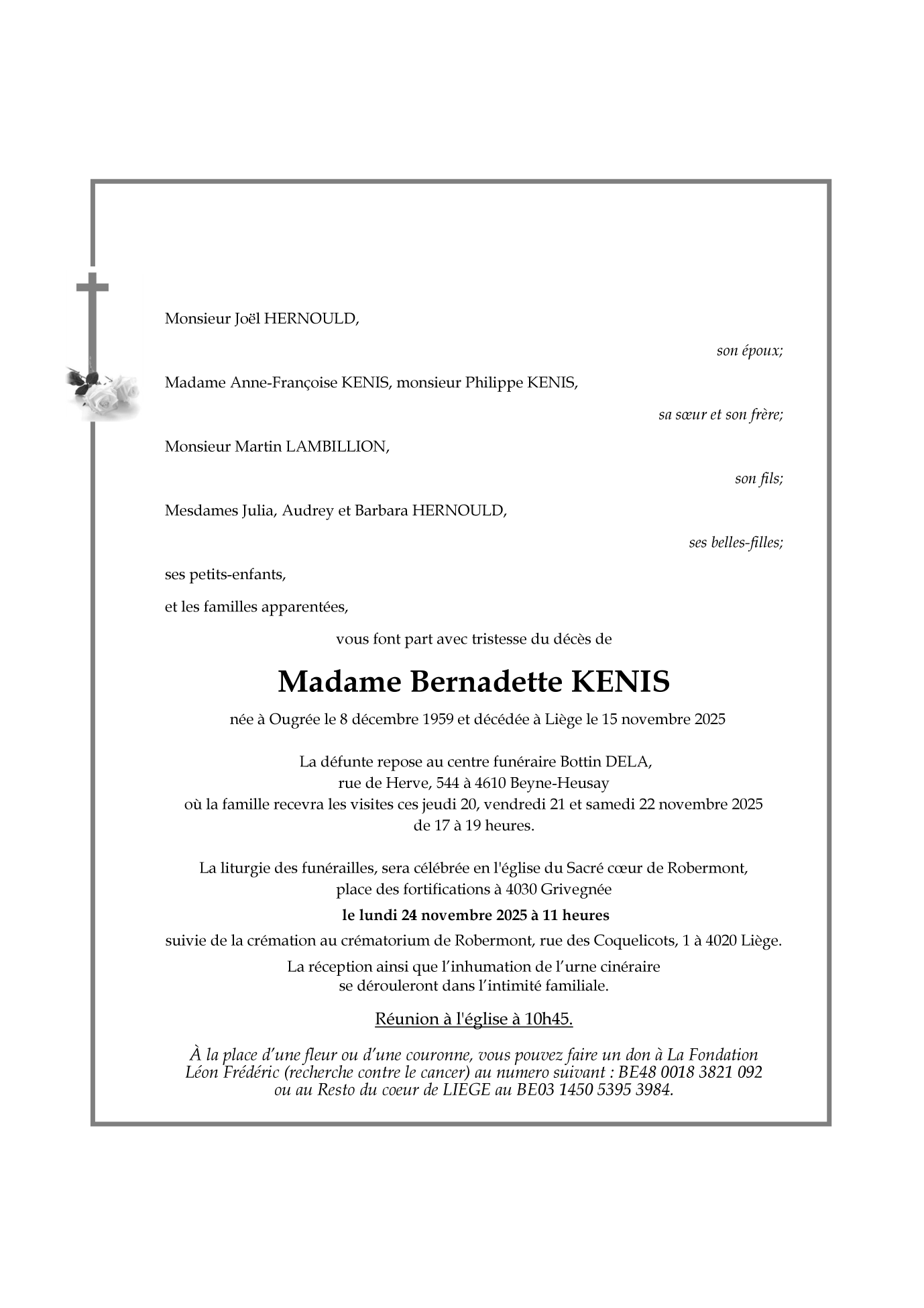 Décédée à Liège (4000) le samedi 15 novembre 2025 à l'âge de 65 ans