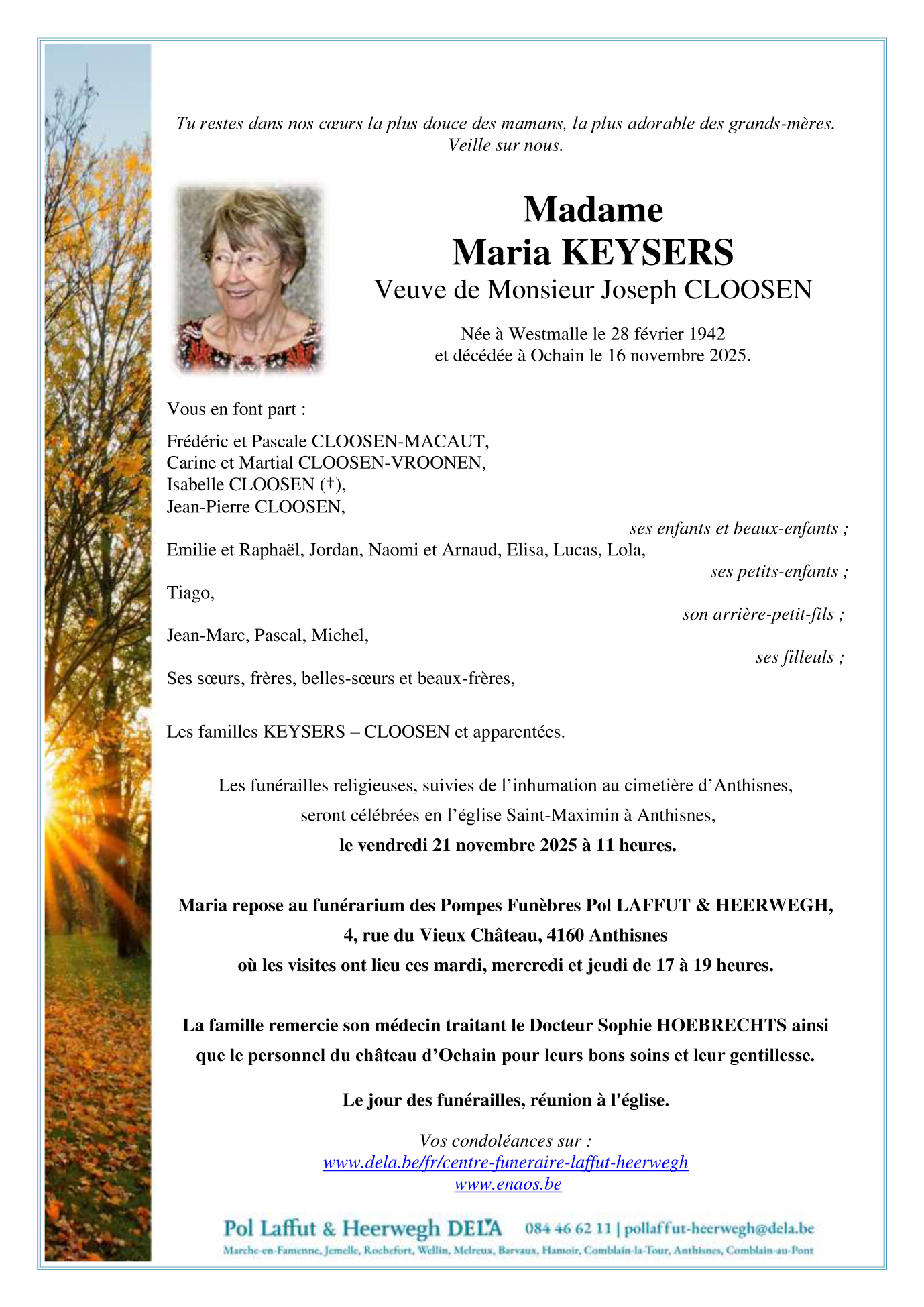 Décédée à Ochain (4560) le dimanche 16 novembre 2025 à l'âge de 83 ans
