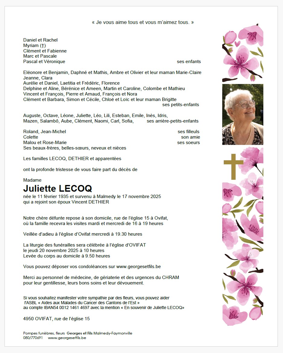 Décédée à Malmedy (4960) le lundi 17 novembre 2025 à l'âge de 90 ans