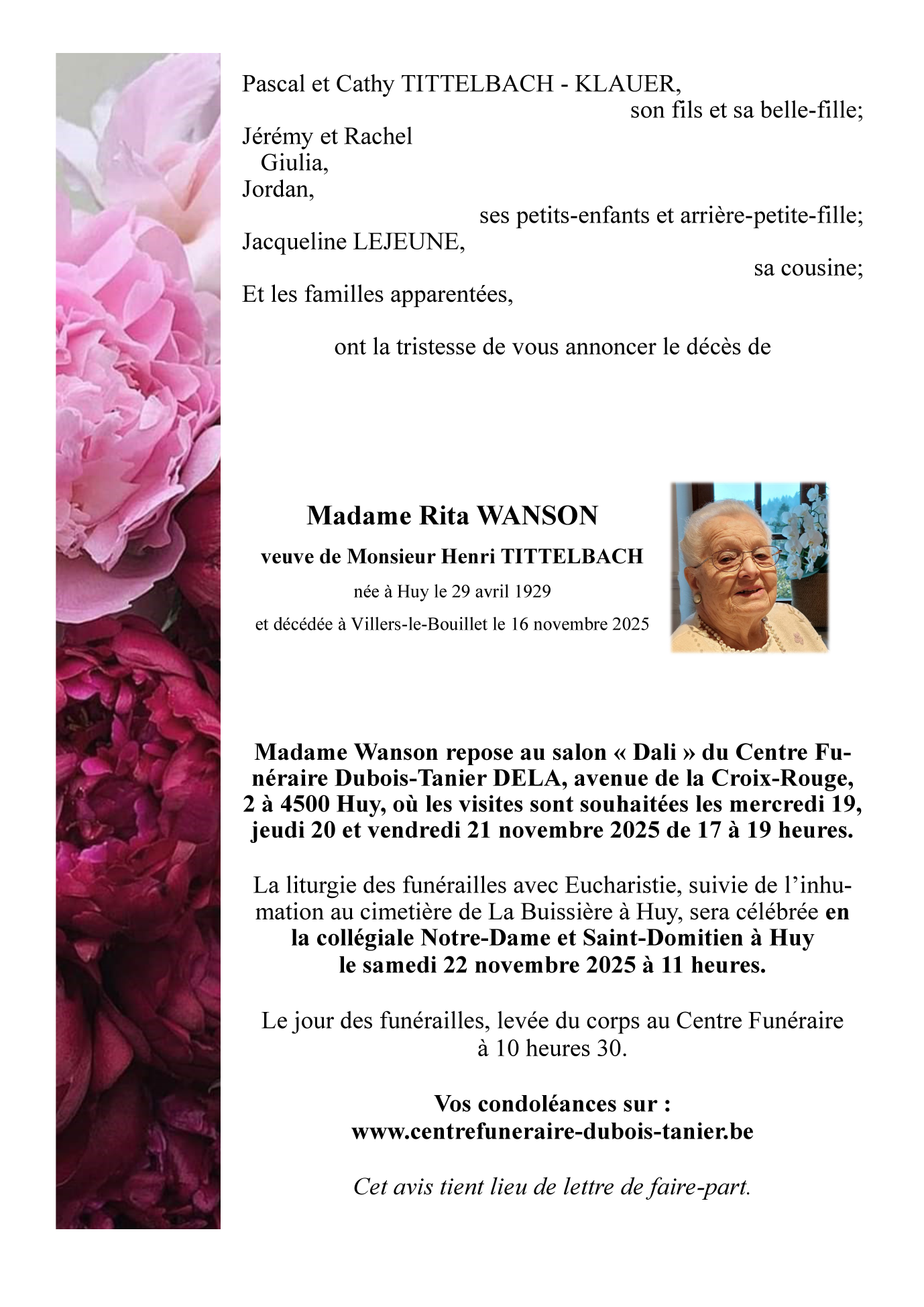 Décédée à Villers-le-Bouillet (4530) le dimanche 16 novembre 2025 à l'âge de 96 ans