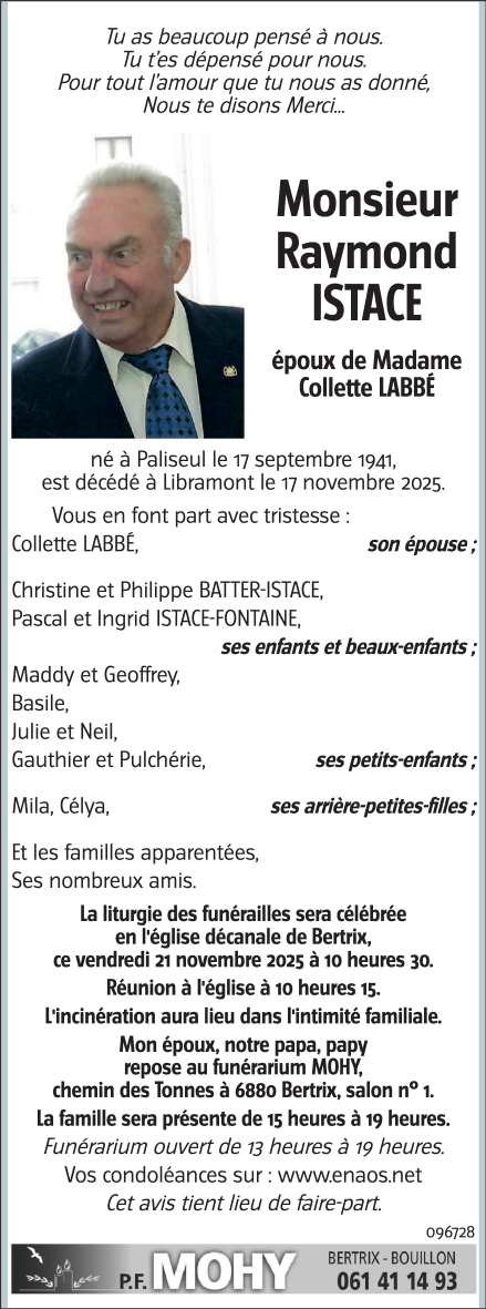 Décédé à Libramont (6800) le lundi 17 novembre 2025 à l'âge de 84 ans