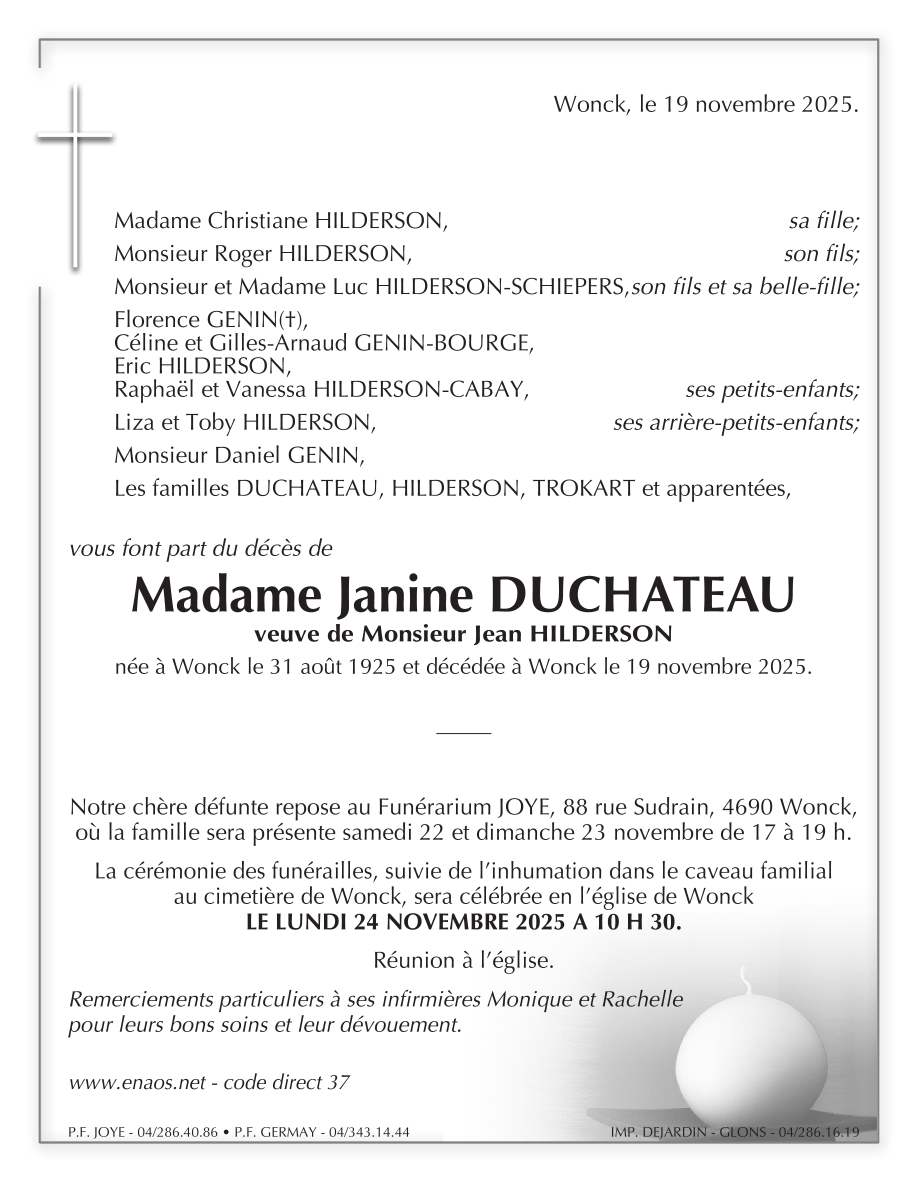Fallecida en Wonck (4690) el miércoles, 19 de noviembre de 2025 a la edad de 100 años
