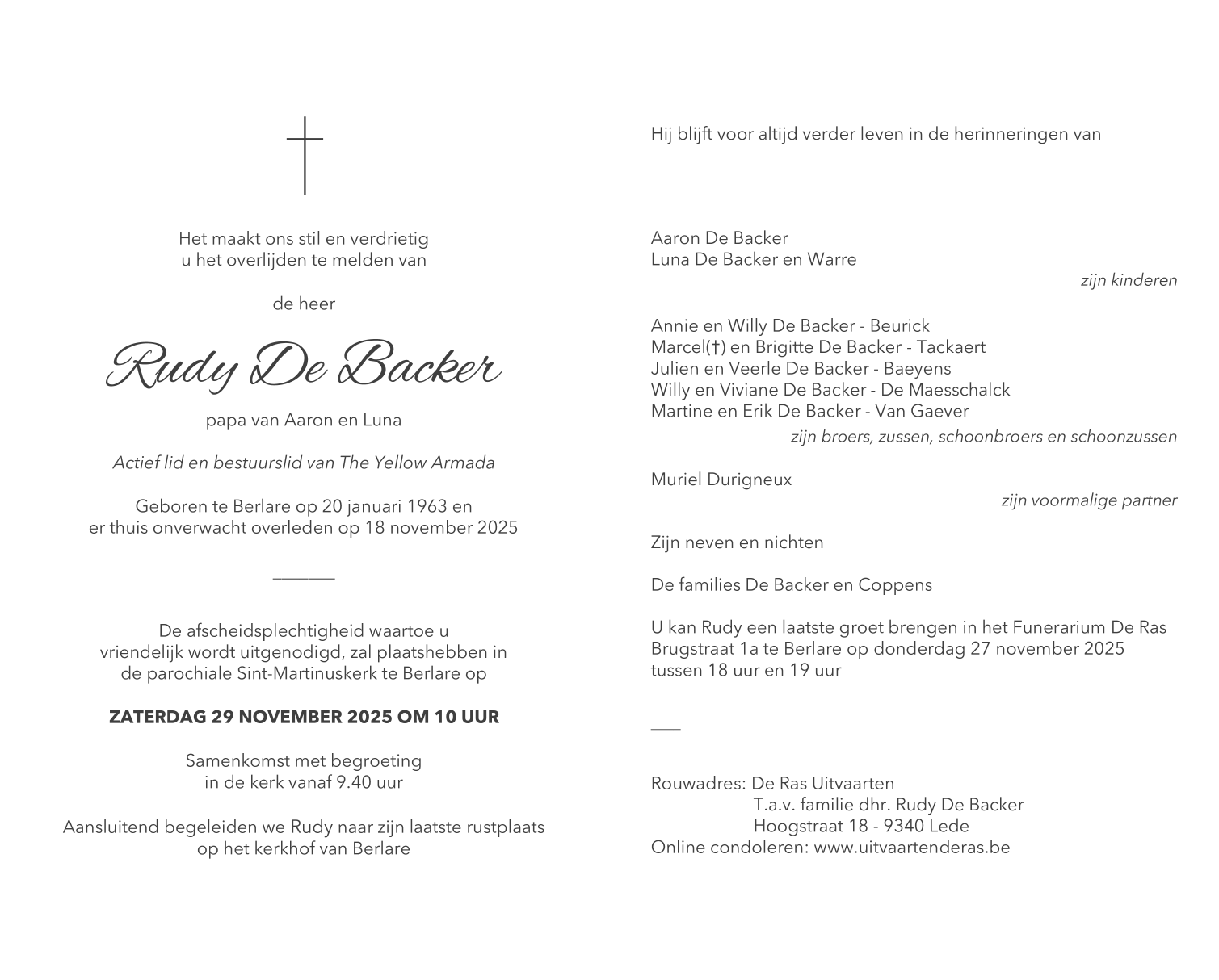 Décédé à Berlare (9290) le mardi 18 novembre 2025 à l'âge de 62 ans