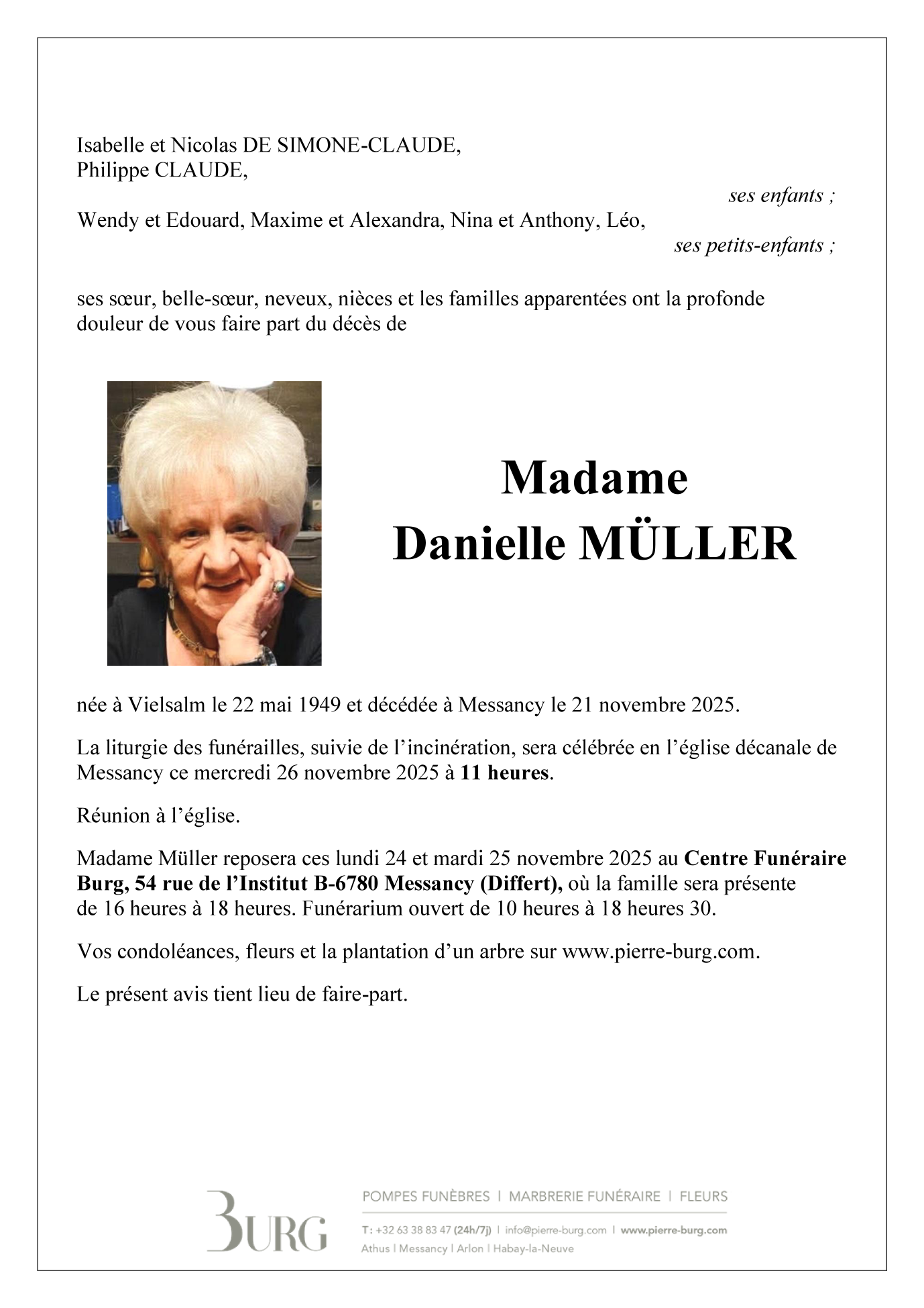 Décédée à Messancy (6780) le vendredi 21 novembre 2025 à l'âge de 76 ans