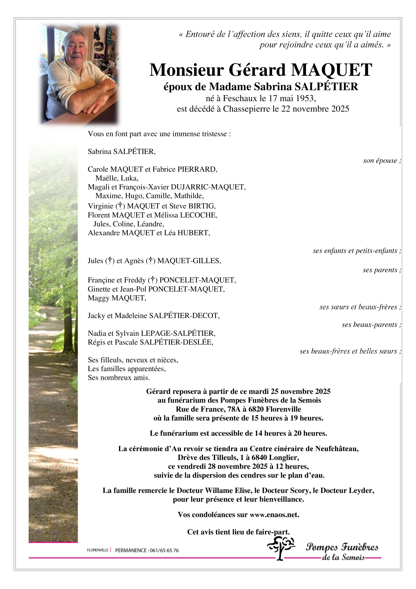 Décédé à Chassepierre (6824) le samedi 22 novembre 2025 à l'âge de 72 ans