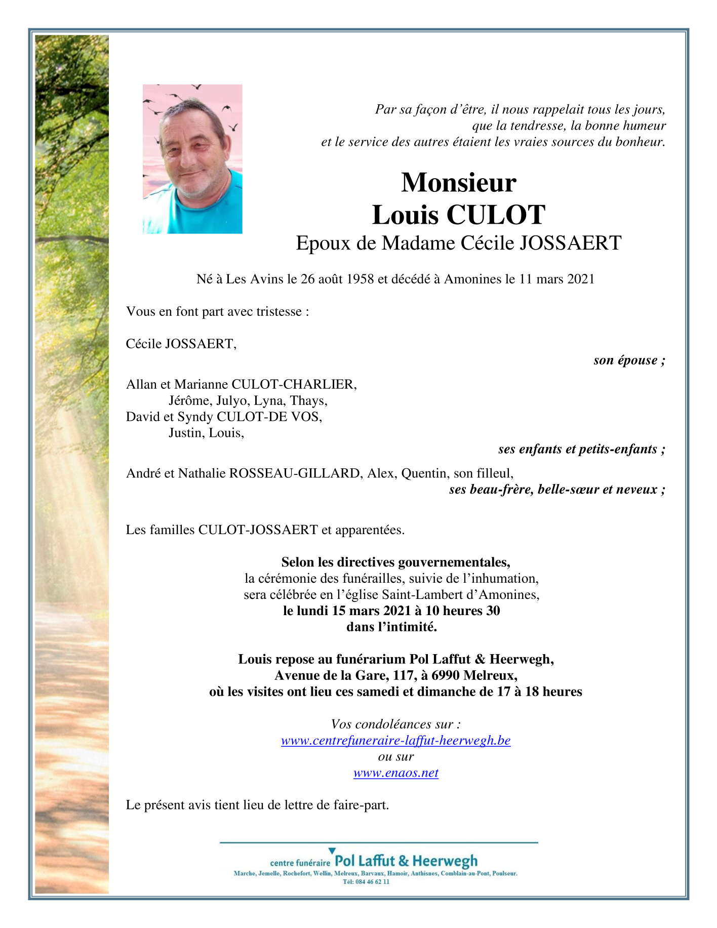 Fallecido en Amonines (6997) el jueves, 11 de marzo de 2021 a la edad de 62 años
