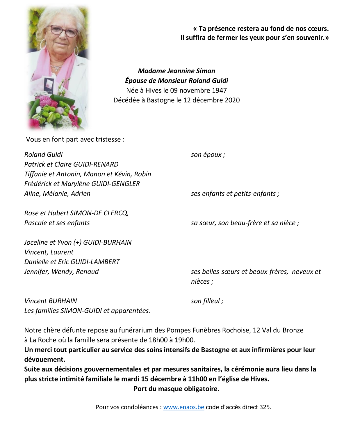 Décédée à Bastogne (6600) le samedi 12 décembre 2020 à l'âge de 73 ans