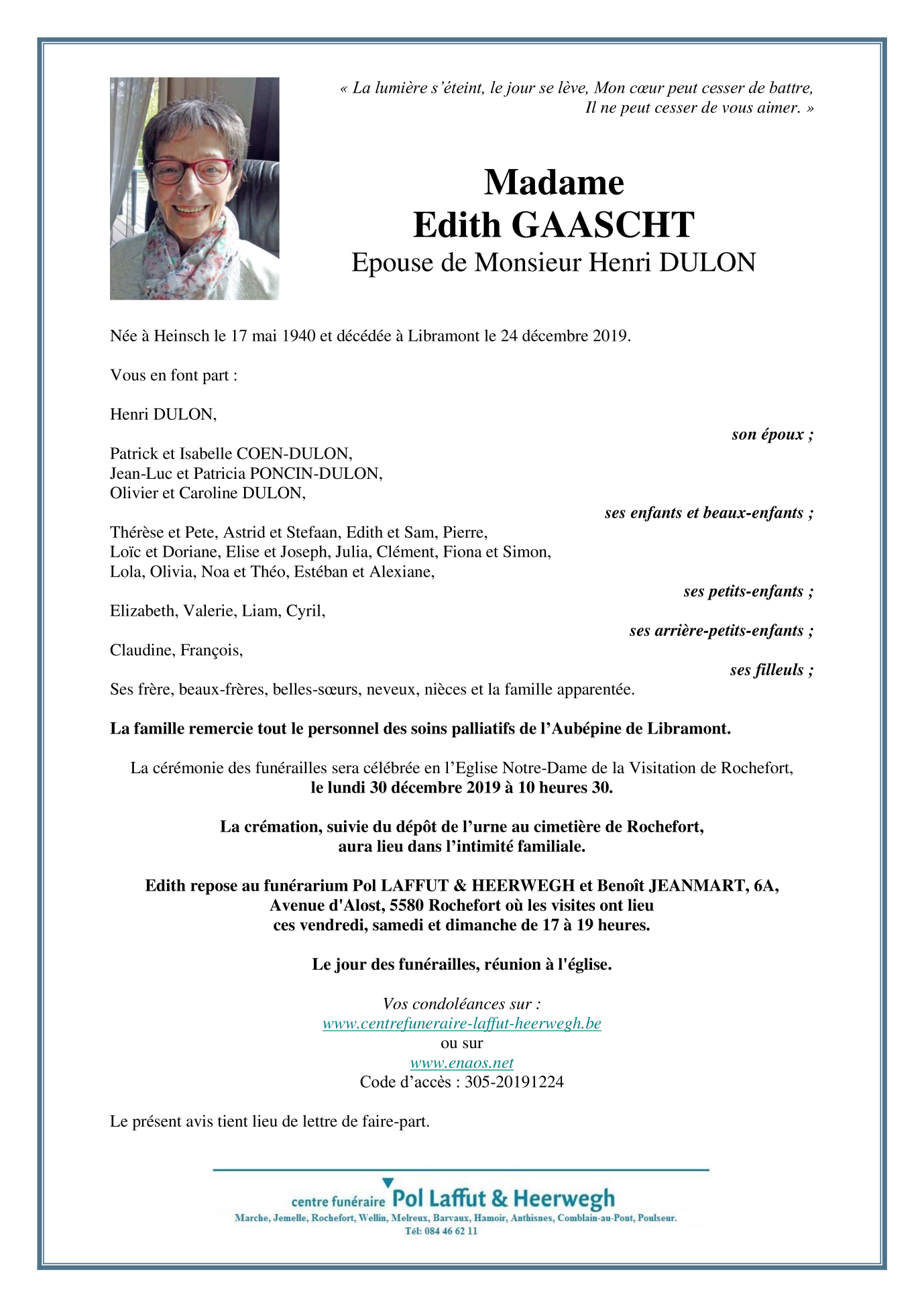 Décédée à Libramont (6800) le mardi 24 décembre 2019 à l'âge de 79 ans