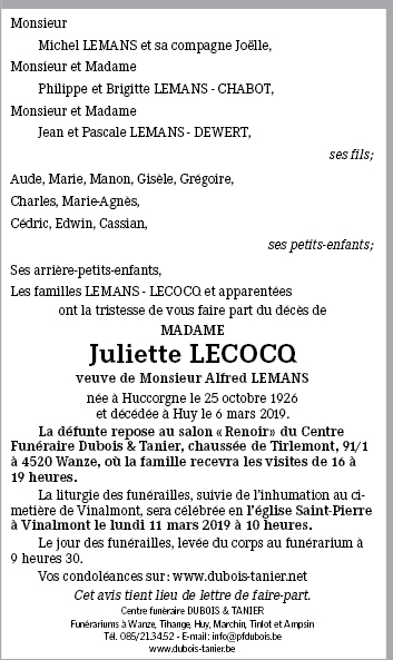 Overleden te Huy (4500) op woensdag 6 maart 2019 op 92-jarige leeftijd