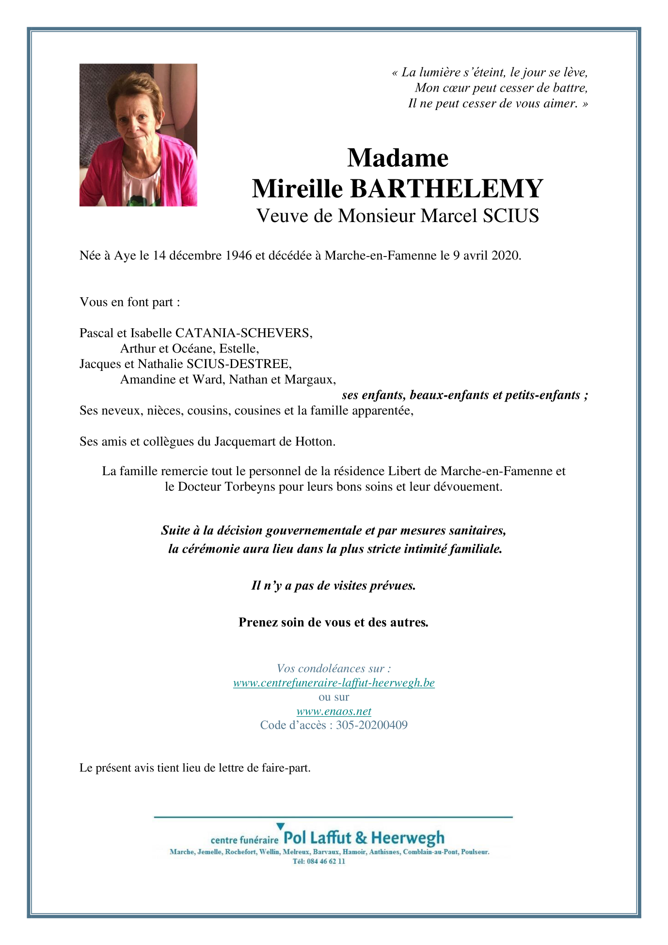 Décédée à Marche-en-Famenne (6900) le jeudi 9 avril 2020 à l'âge de 73 ans
