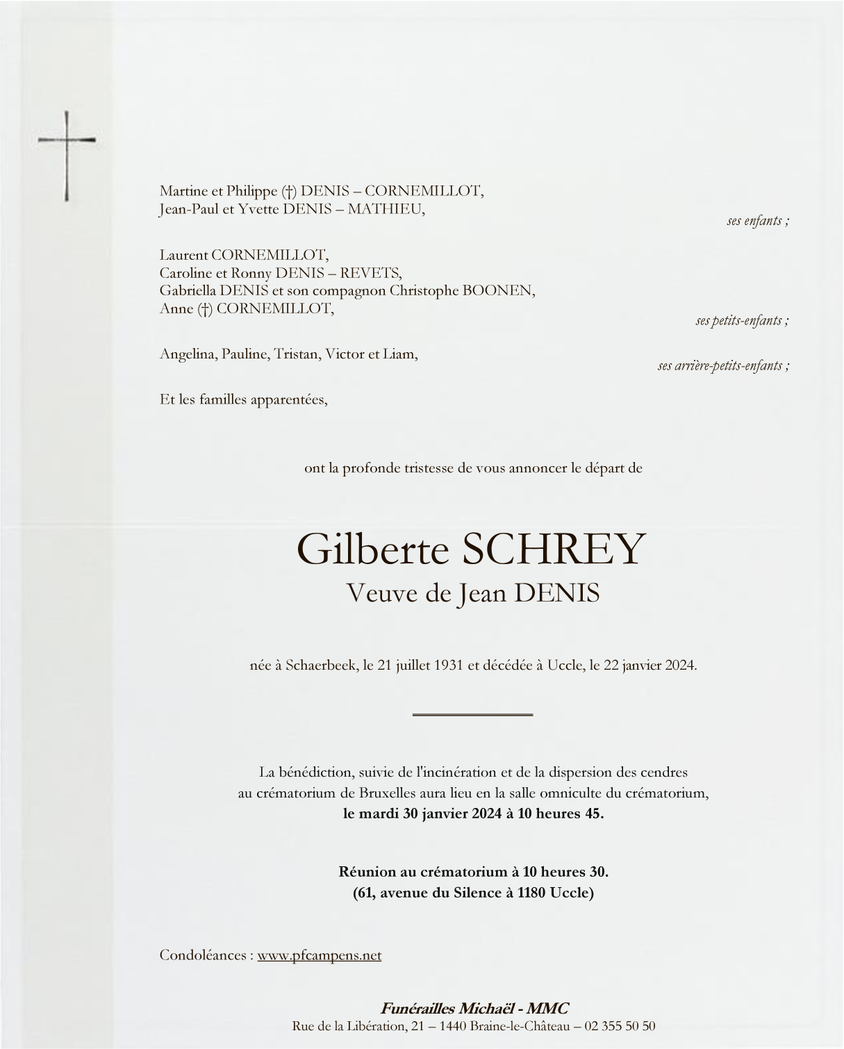 Overleden te Uccle (1180) op maandag 22 januari 2024 op 92-jarige leeftijd