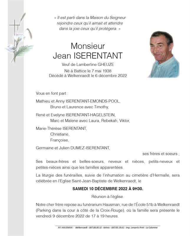 Décédé à Welkenraedt (4840) le mardi 6 décembre 2022 à l'âge de 84 ans