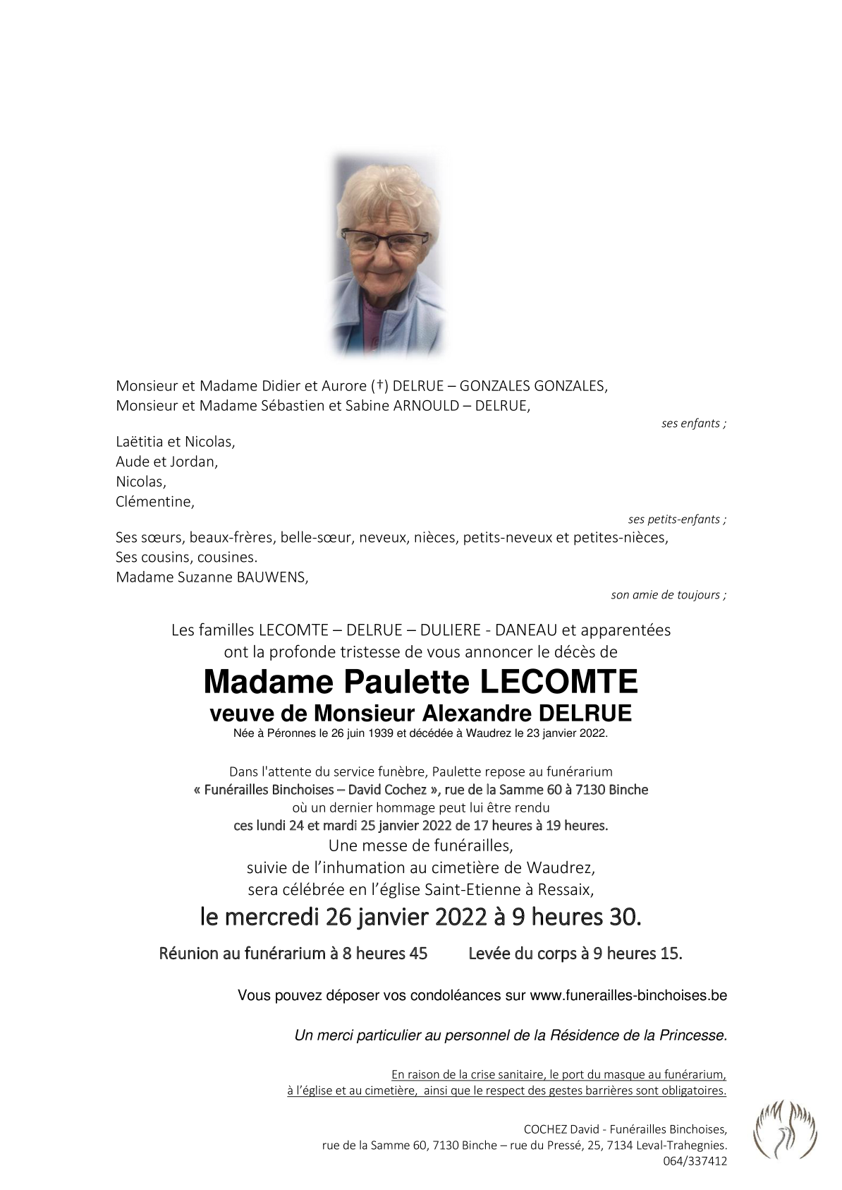Fallecida en Binche (7130) el domingo, 23 de enero de 2022 a la edad de 82 años