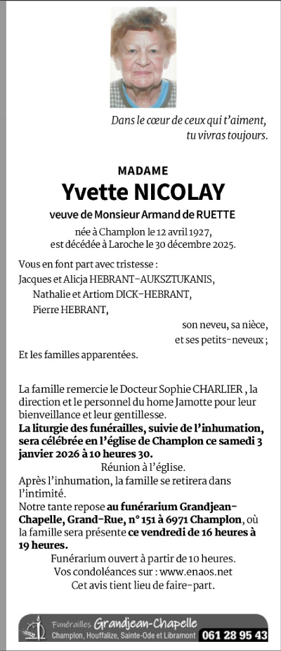 Décédée à La Roche-en-Ardenne (6980) le mardi 30 décembre 2025 à l'âge de 98 ans