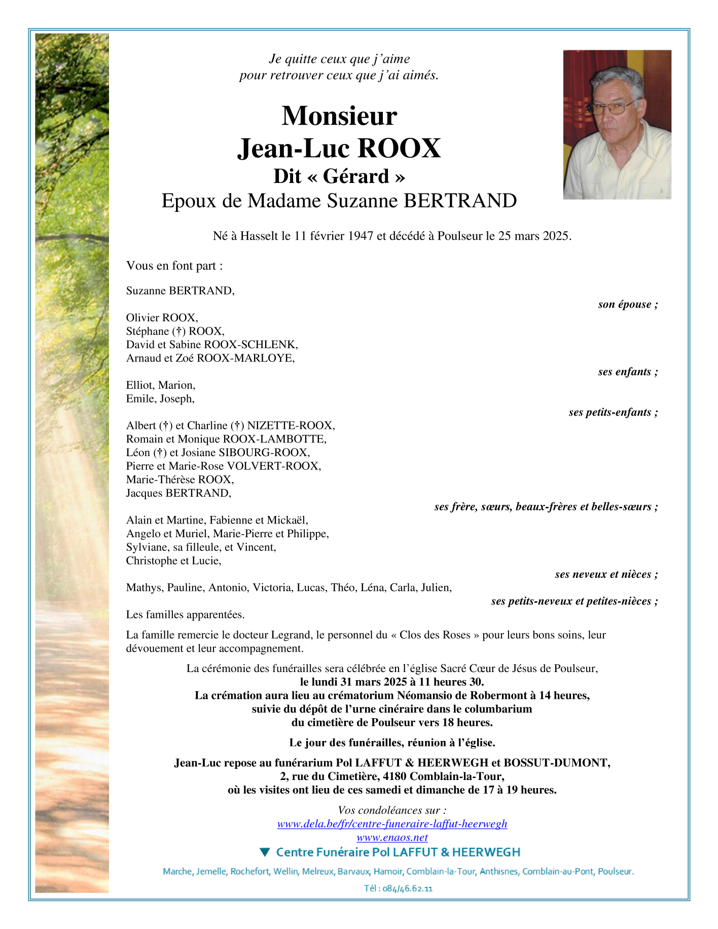Died in Poulseur (4171) on 25 March 2025 at the age of 78 years