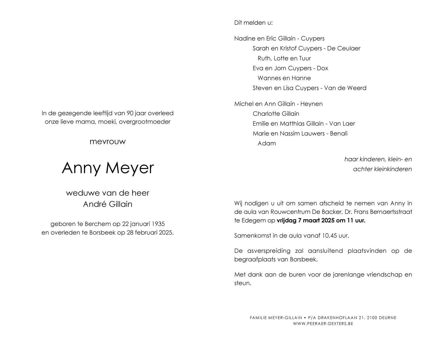 Décédée à Borsbeek (Antw.) (2150) le vendredi 28 février 2025 à l'âge de 90 ans