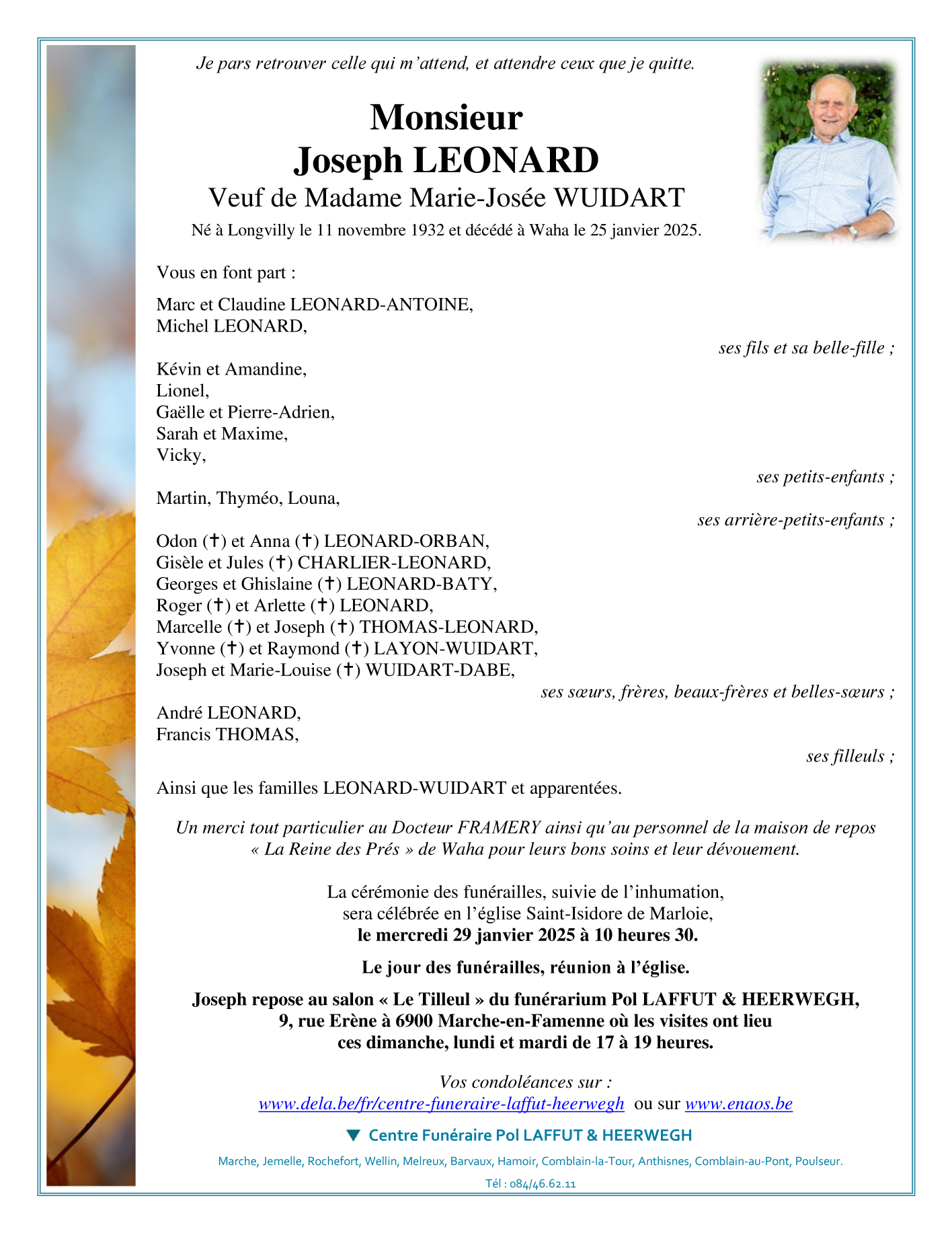 Décédé à Waha (6900) le samedi 25 janvier 2025 à l'âge de 92 ans