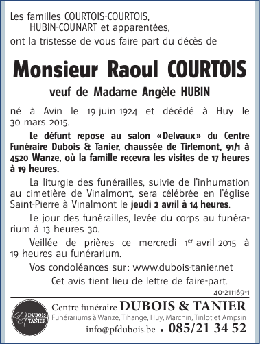 Fallecido en Huy (4500) el lunes, 30 de marzo de 2015 a la edad de 90 años