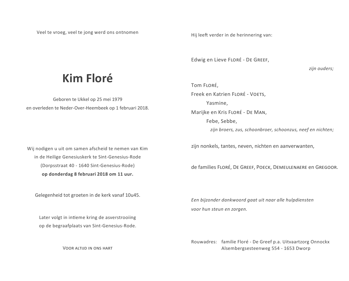 Décédé à Neder-Over-Heembeek (Bru.) (1120) le jeudi 1 février 2018 à l'âge de 38 ans
