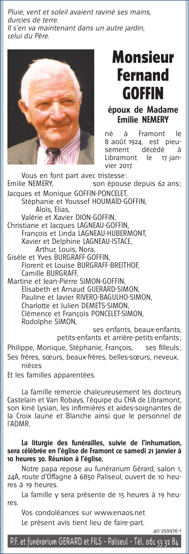 Died in Libramont (6800) on 17 January 2017 at the age of 92 years