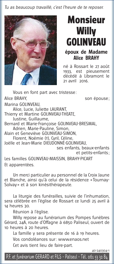 Fallecido en Libramont (6800) el jueves, 21 de abril de 2016 a la edad de 82 años