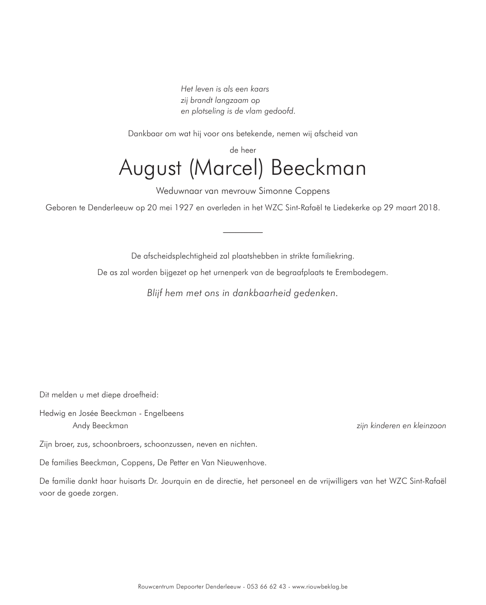 Décédé à Liedekerke (1770) le jeudi 29 mars 2018 à l'âge de 90 ans