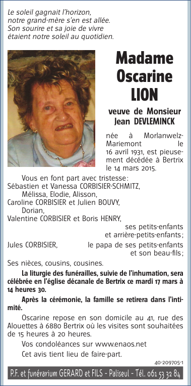 Décédée à Bertrix (6880) le samedi 14 mars 2015 à l'âge de 83 ans