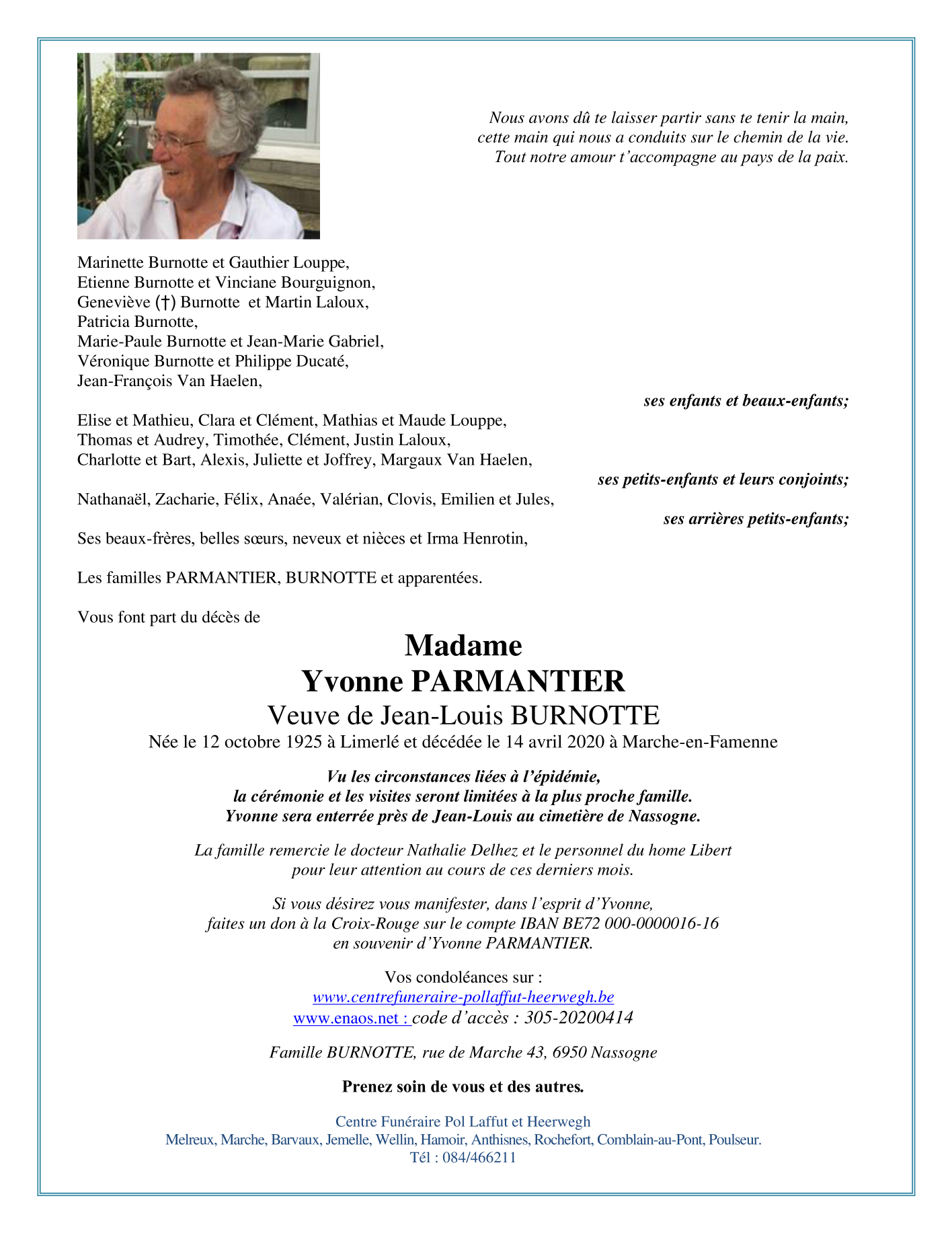 Overleden te Marche-en-Famenne (6900) op dinsdag 14 april 2020 op 94-jarige leeftijd
