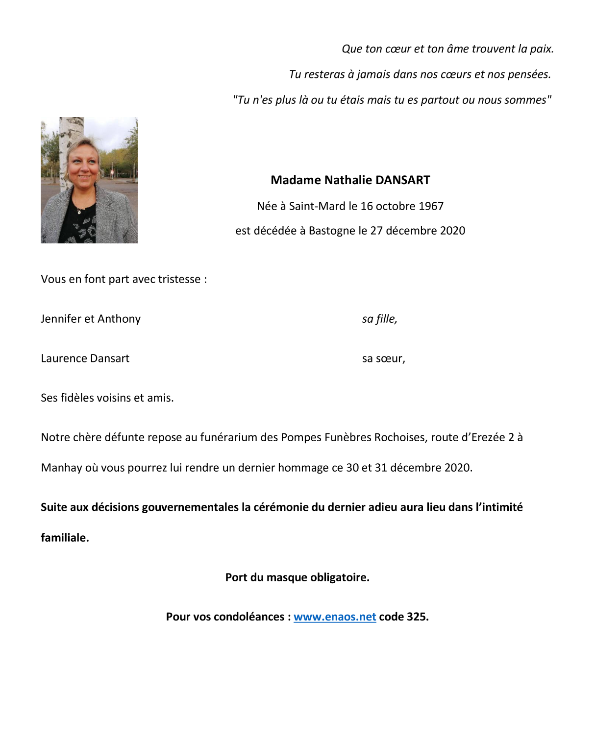 Décédée à Bastogne (6600) le dimanche 27 décembre 2020 à l'âge de 53 ans